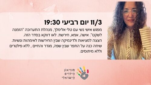 מפגש אישי נשי עם טלי אלימלך, מנהלת התערוכה "הזמנה לשקט". אישה, אמא, חירשת. לאו דווקא בסדר הזה.